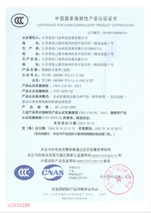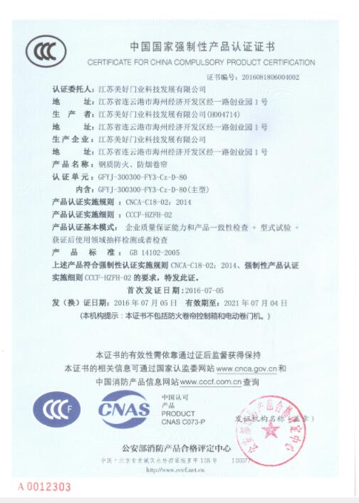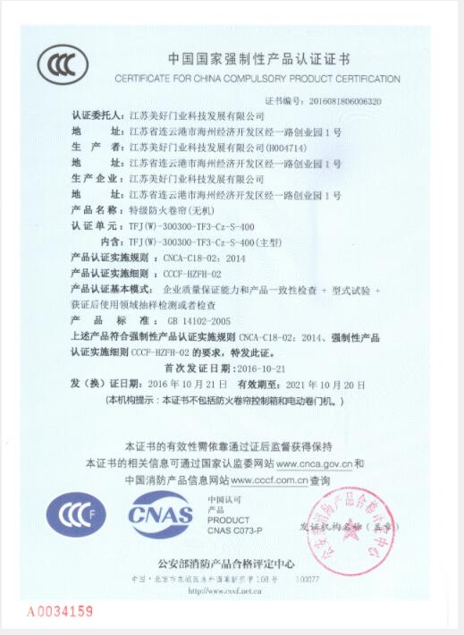 江蘇美好門業(yè)科技發(fā)展有限公司防火卷簾門順利通過公安部消防產品合格評定中心的檢測并榮獲3C證書
