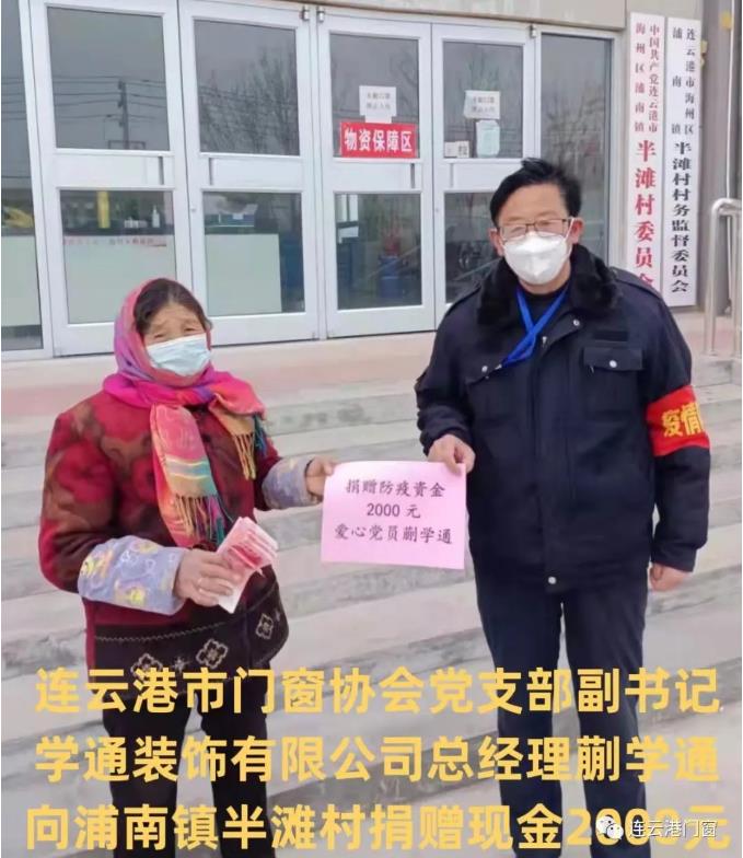 ? ? ??連云港門窗協(xié)會黨支部副書記(學通裝飾公司總經理)蒯學通先后為東海縣白塔工地、海州區(qū)浦南鎮(zhèn)半灘村、浦南鎮(zhèn)康寧社區(qū)捐贈現金及物資,累計8000元。