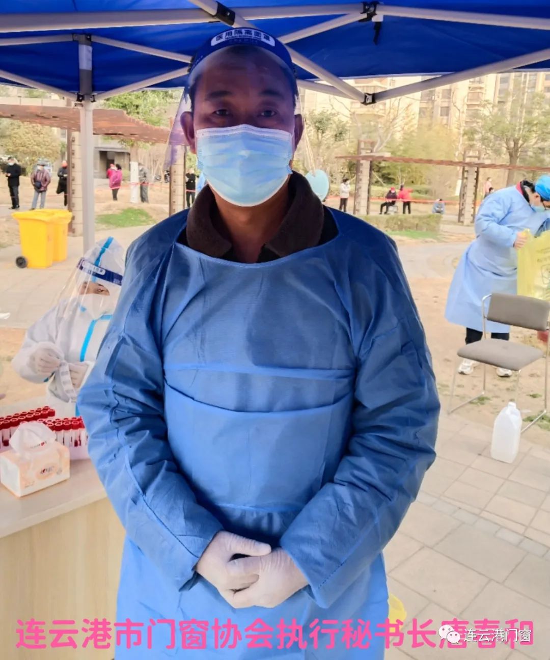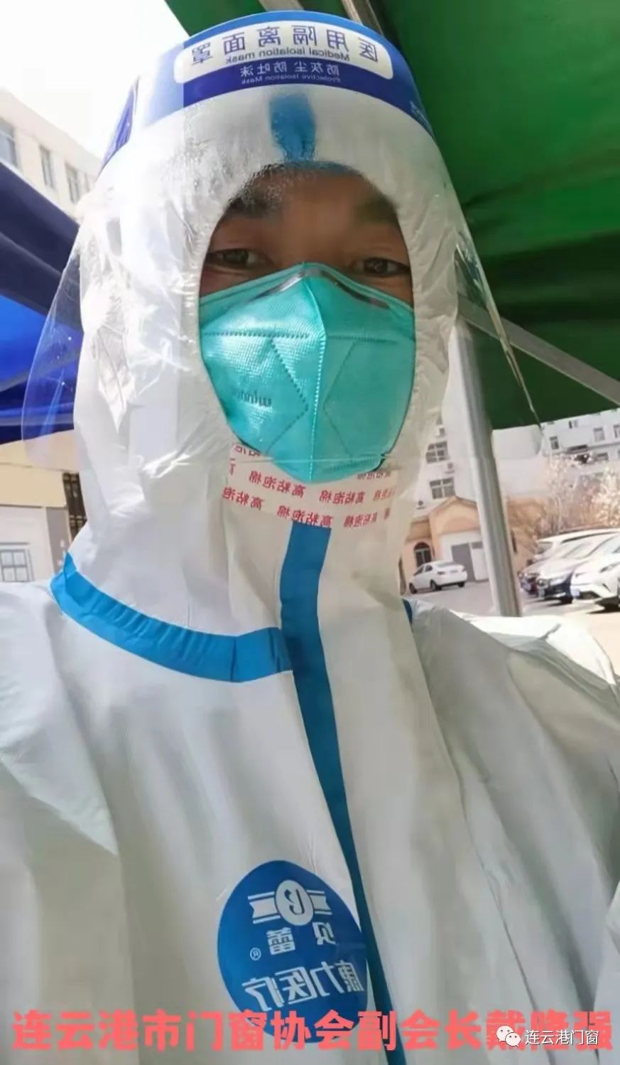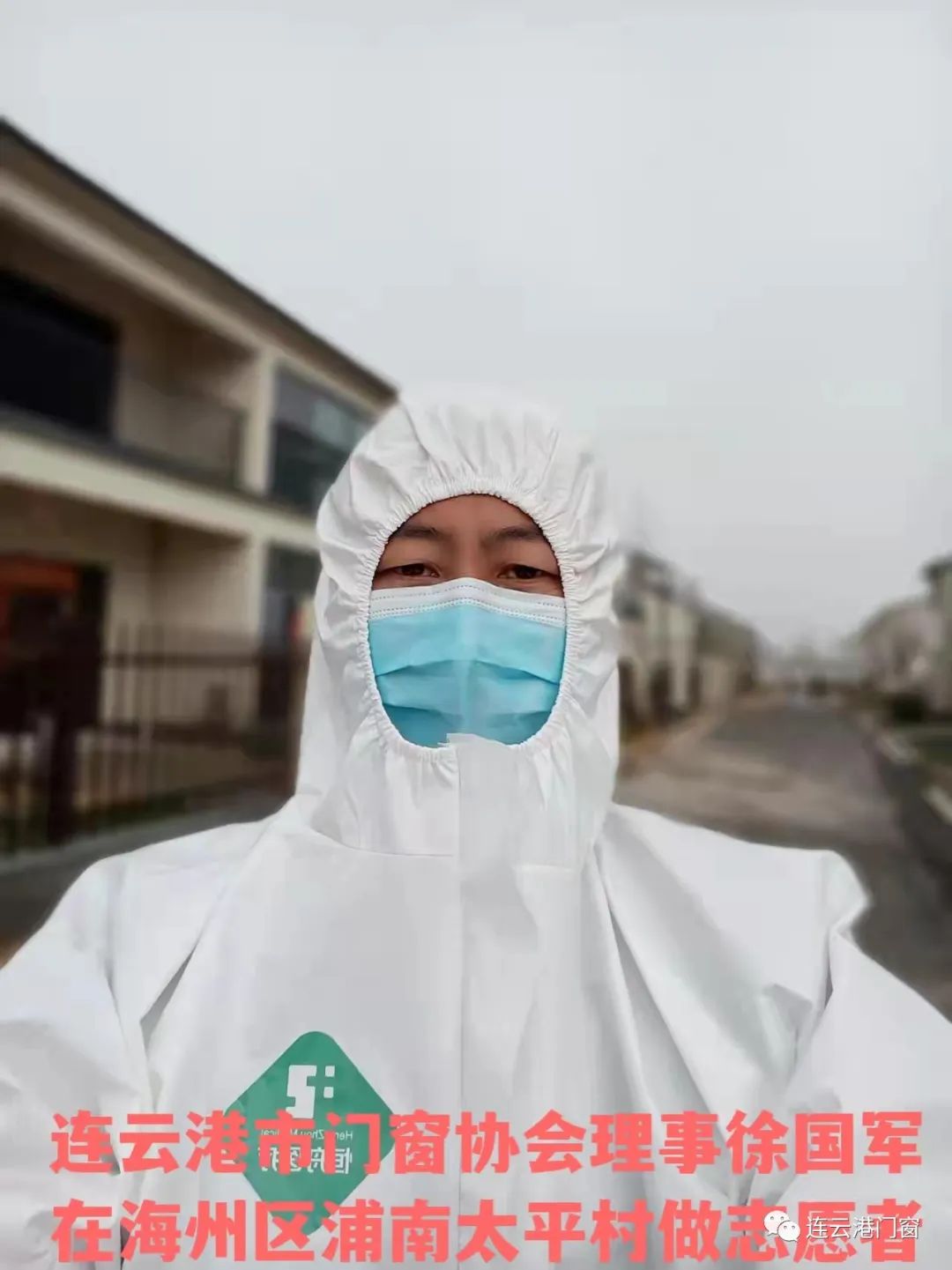 ? ? ? 連云港市門窗協(xié)會理事(東海百勝門業(yè)總經理)姜陳勇在東海縣石榴鎮(zhèn)做自愿者參與抗疫工作。