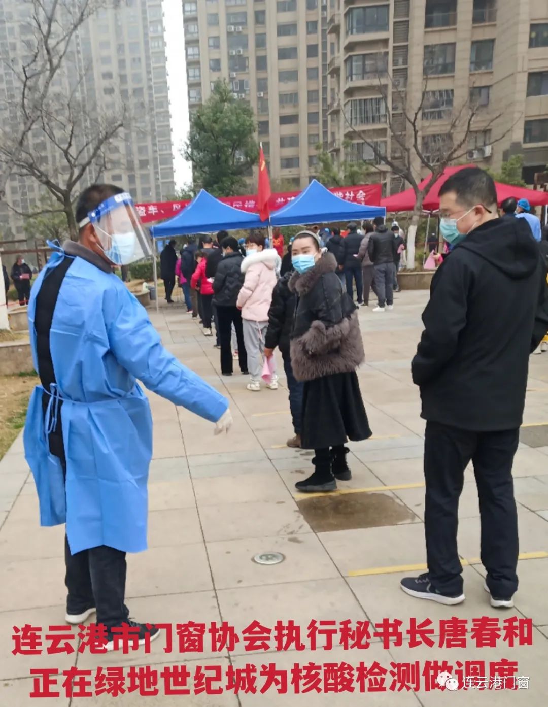 ? ? ??連云港市門窗協(xié)會執(zhí)行秘書長(叁陸久裝飾總經理)唐春和在“綠地世紀城”做自愿者參與抗疫工作。