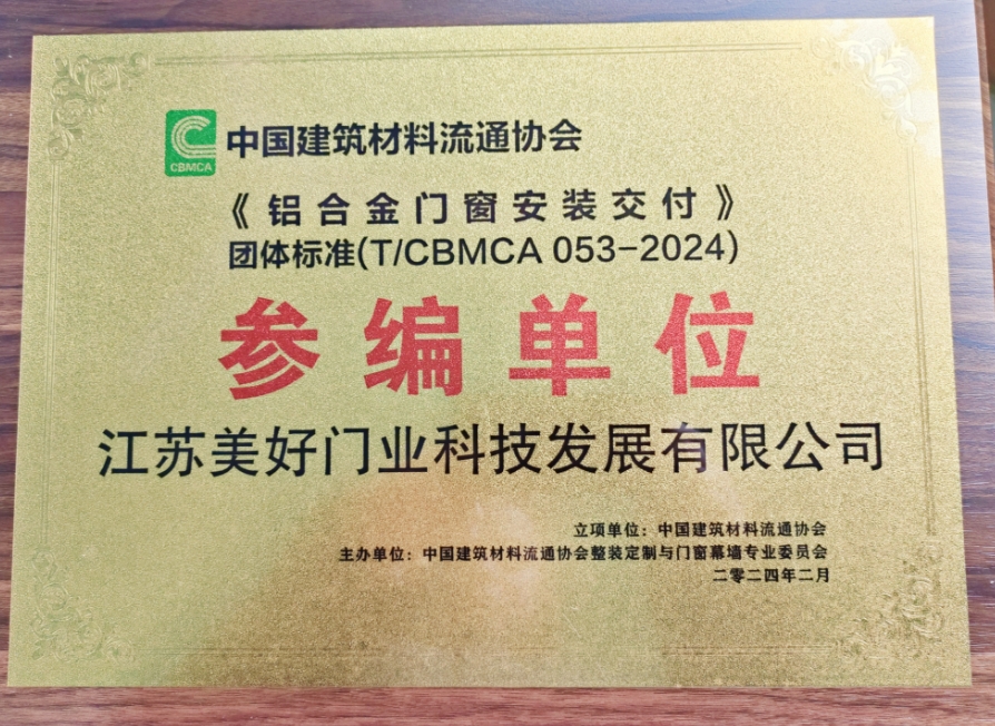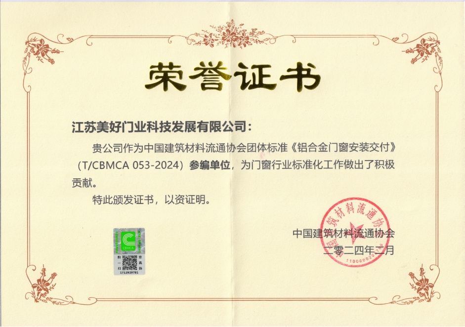 江蘇美好門業科技發展有限公司《鋁合金門窗安裝交付》標準參編證書