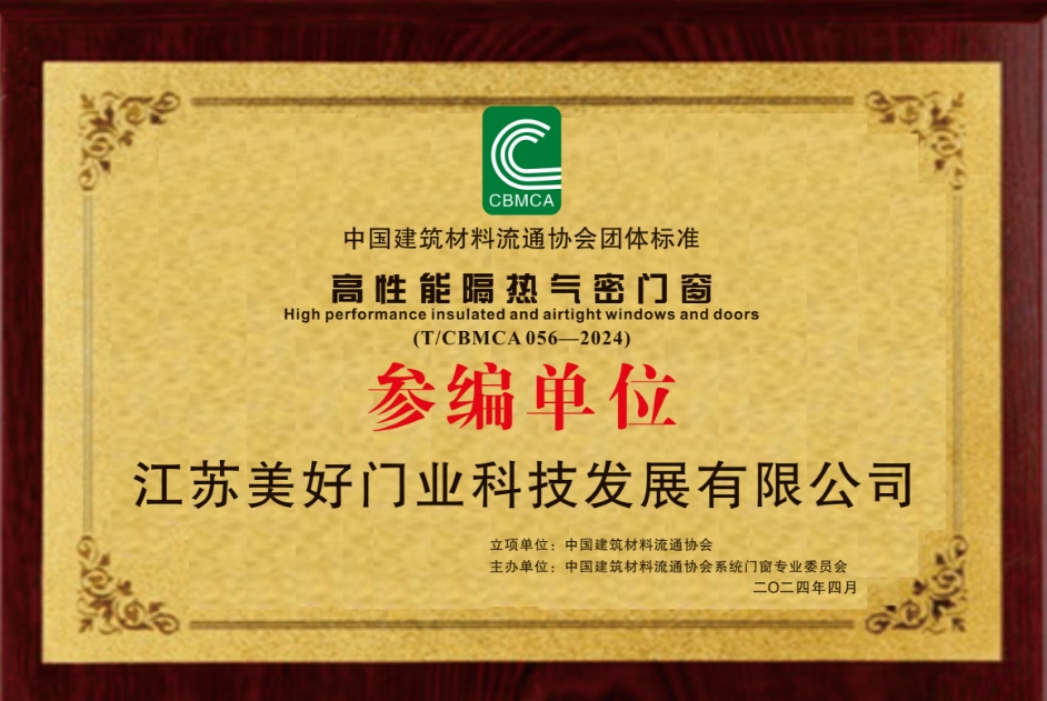 江蘇美好門業科技發展有限公司《 高性能隔熱氣密門窗》標準參編證書