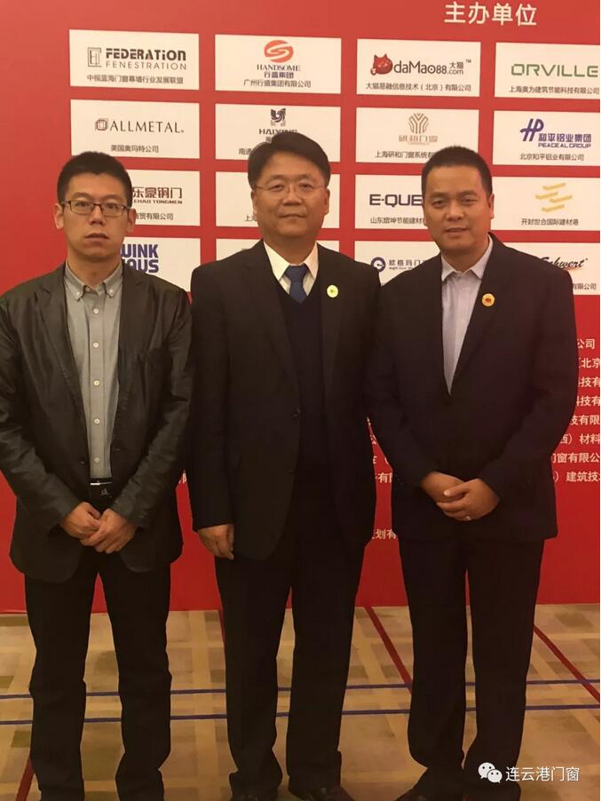 連云港市門窗協會會長潘國柱(右一)、連云港市門窗協會專家顧問亓彥濤(左一)與主辦方“中視藍海門窗幕墻行業發展聯盟”秘書長程學軍先生合影留念。